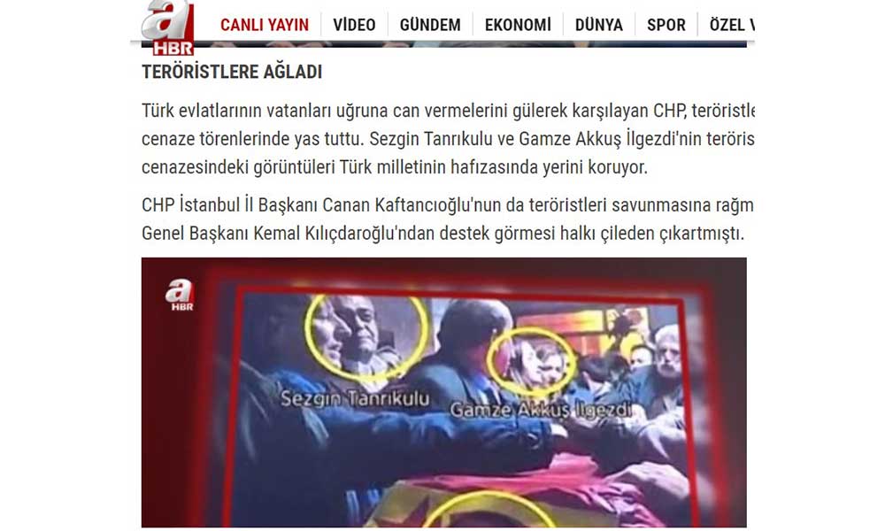 İktidara yakınlığıyla bilinen A Haber'de, CHP İstanbul Milletvekili Sezgin Tanrıkulu’nun, "terör örgütü PKK'nın cenazesine katıldığı" yalanı haberleştirildi.