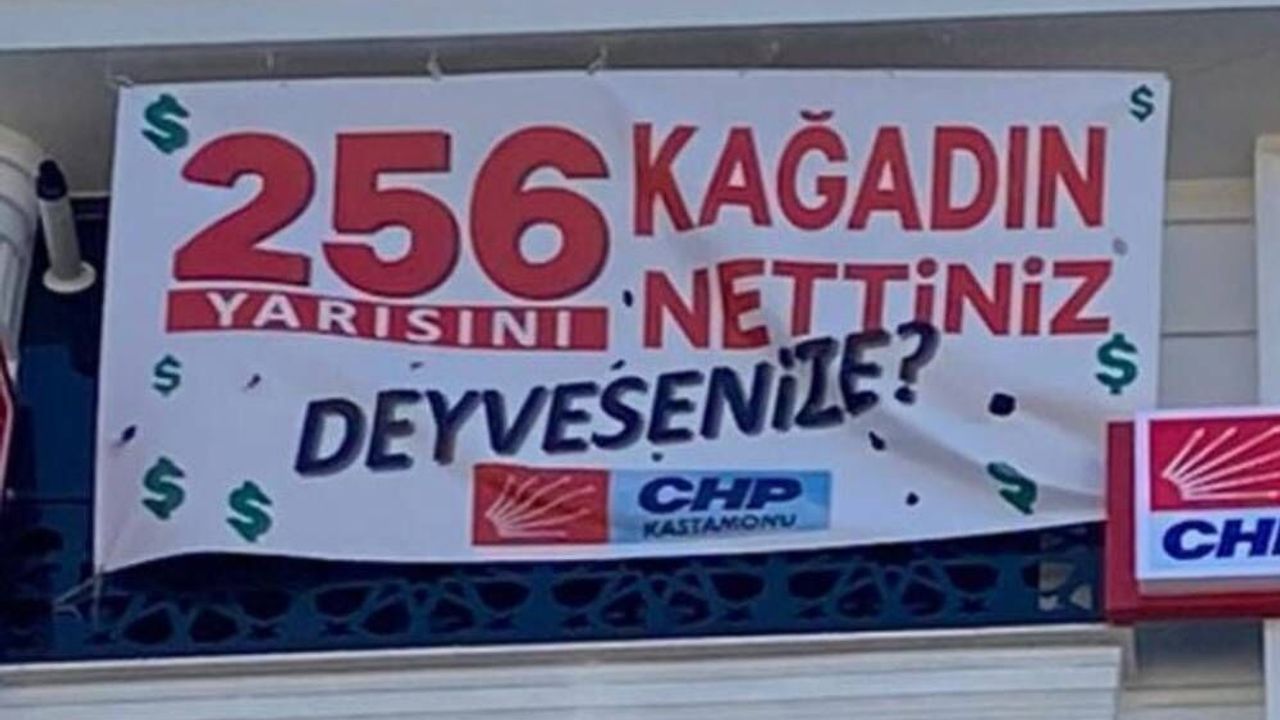 CHP Kastamonu İl Başkanlığı binasından sökülen "128 milyar dolar nerede?" yazılı afişin yerine asılan "256 kağadın yarısını nettiniz?" pankartı da kaldırıldı. "256 kağadın yarısını nettiniz?" afişini indirmek için gelen...