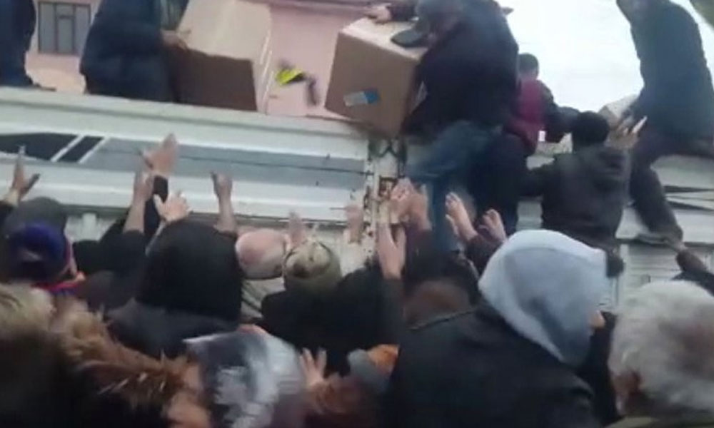 Yardımı kimin yaptığının anlaşılamadığı görüntülerde, bir kamyonetin üstündeki kişilerin aşağıdaki vatandaşlara yardım kolilerini atarcasına verdiği görülüyor. Aşağıdaki vatandaşlar da kolilerden almaya çalışınca izdiham çıkıyor. Görüntülerde bazı depremzedelerin, kamyonetin üzerinden koli atan kişilere, 'Bunlar ne yapıyor ya!', 'Rezalet', 'Atmayın, atma, atma!' tepkisi verdiği duyuluyor.