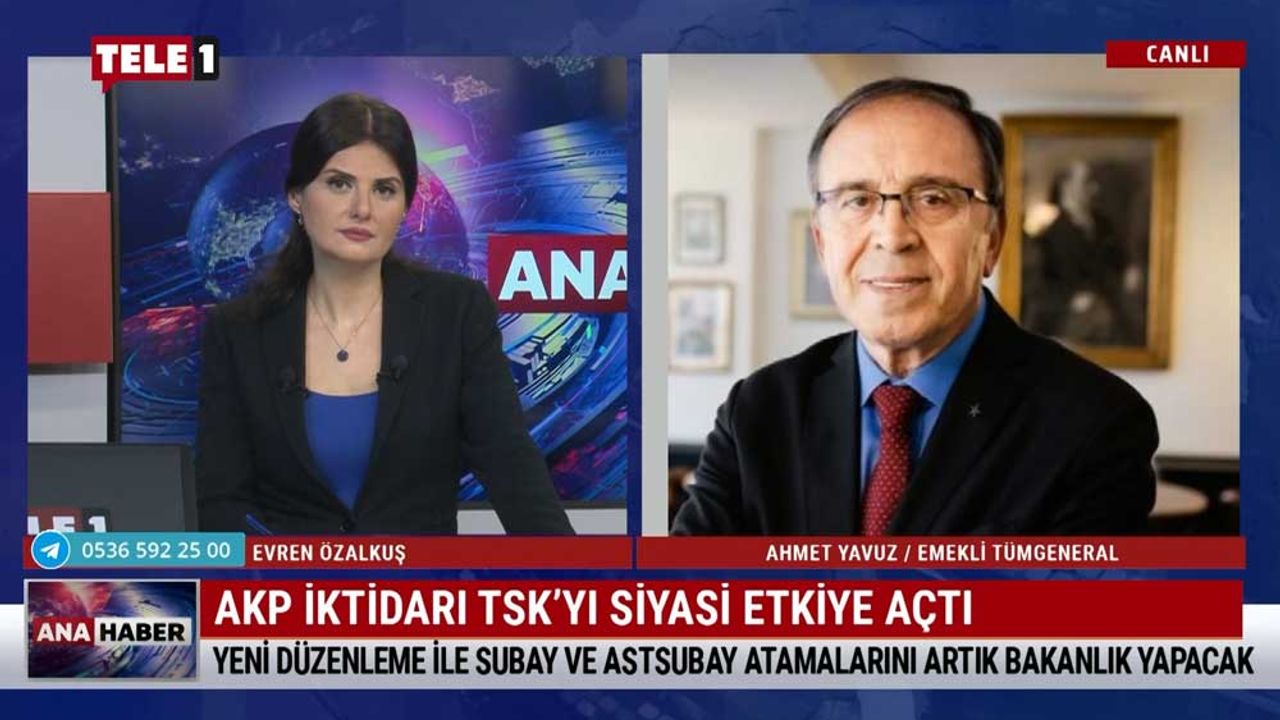 Evren Özalkuş'un sunduğu TELE1 Ana Haber'in bugünkü konuğu, Emekli Tümgeneral Ahmet Yavuz oldu. Yavuz, yeni düzenleme ile subay ve astsubay atamalarının bakanlık tarafından yapılacak olmasını değerlendirdi.