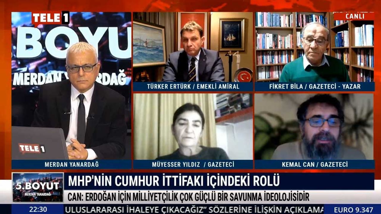 Genel "Erdoğan hiç bu kadar zayıf olmamıştı" 27.11.2020 - 22:48 27.11.2020 - 22:48 Merdan Yanardağ'ın sunduğu 5. Boyut'un bu haftaki konukları; Gazeteci Kemal Can, OdaTV Ankara Haber Müdürü Müyesser Yıldız, Gazeteci - Yazar Fikret Bila ve Emekli Amiral Türker Ertürk oldu. Can, MHP'nin...
