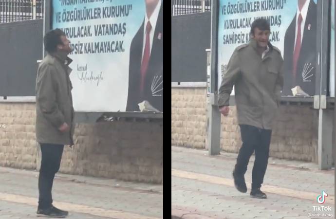Hatay’da bir vatandaş, sokakta yürürken AKP’li Cumhurbaşkanı Recep Tayyip Erdoğan’ın bilboard panosundaki fotoğrafına isyan etti.