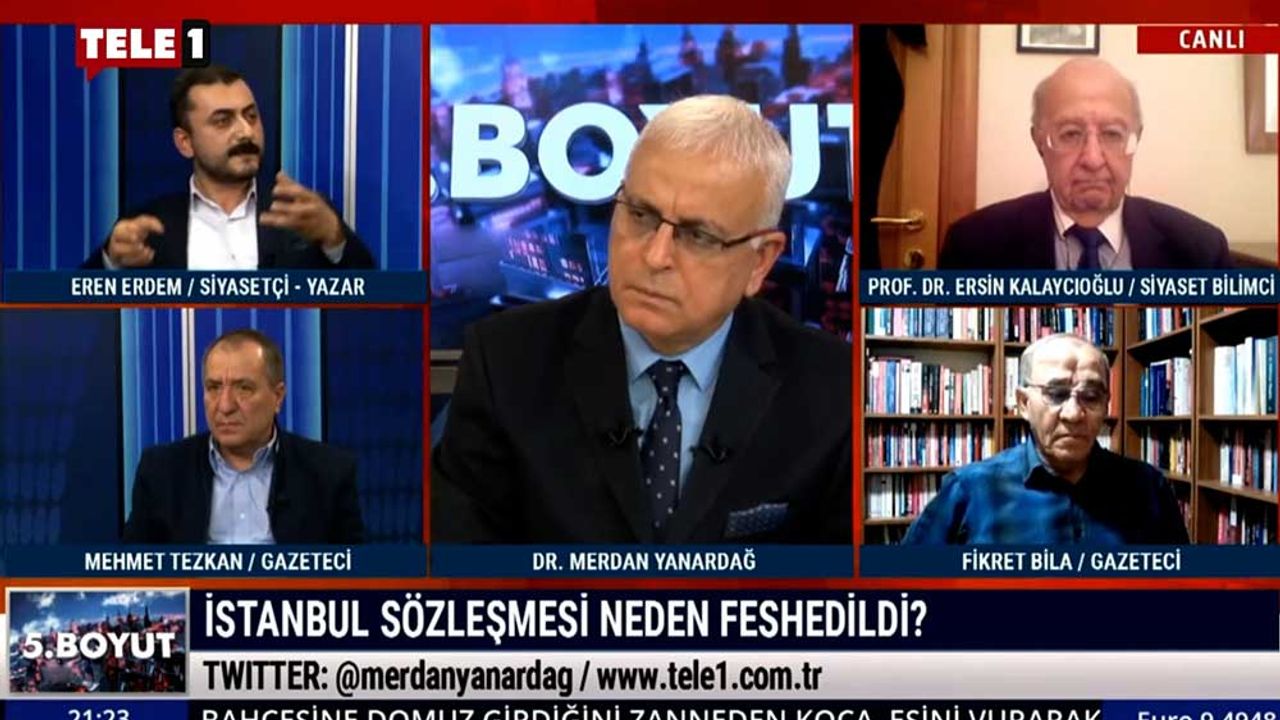 Merdan Yanardağ'ın yönettiği 5. Boyut'ta Siyasi Analist Eren Erdem, Gazeteci Mehmet Tezkan, Gazeteci Fikret Bila konukları Siyaset Bilimci Prof. Dr. Ersin Kalaycıoğlu oldu. Programda, İstanbul Sözleşmesi'nin feshi ve Montrö ve...