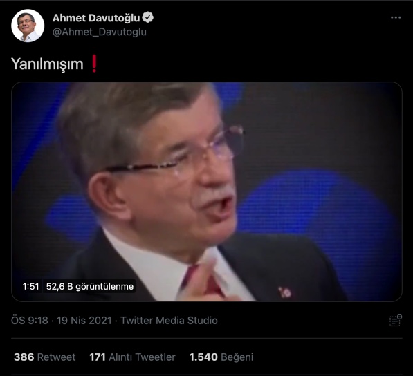 Eski başbakan, AKP'nin eski Genel Başkanı ve Gelecek Partisi Genel Başkanı Ahmet Davutoğlu sosyal medya hesabından "Yanılmışım" notu ile bir video paylaştı. Davutoğlu, AKP'yi eleştirdi.