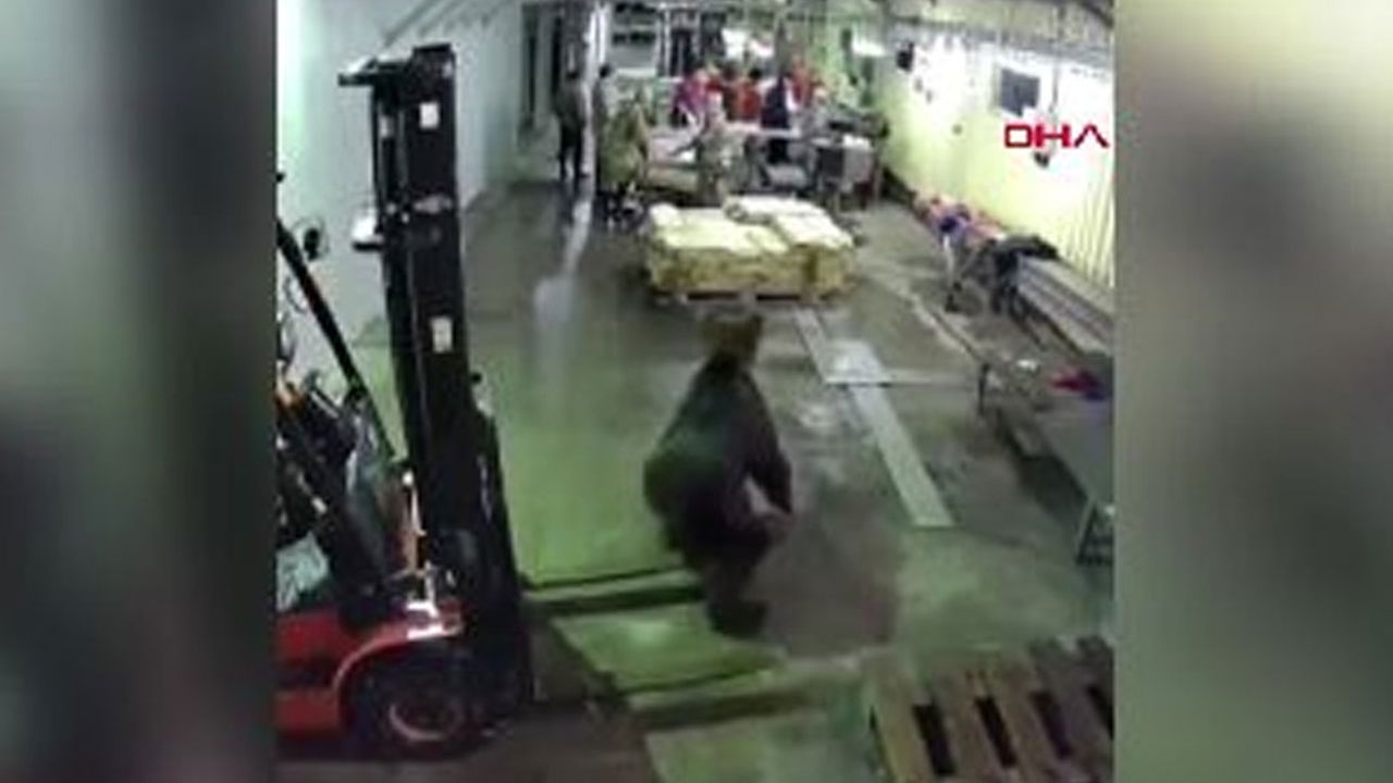 Rusya'da su ürünleri fabrikasına ayının girmesi işçilerin korkup kaçışmasıyla sonuçlandı.O anlar saniye saniye kaydedildi.