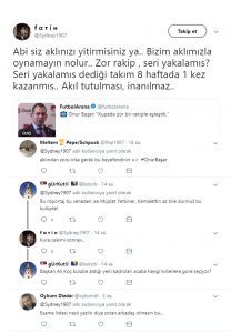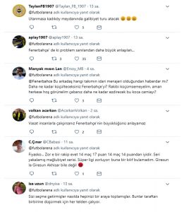 - @Fenerbahçe bu arkadaş hangi takımın idari menajeri olduğundan haberdar mı? Daha ne kadar küçülteceksiniz Fenerbahçe’yi? Rakibi küçümsemeyelim, aman herkese hoş görünelim çabanız daha ne kadar ezdirecek bu koca camiayı?