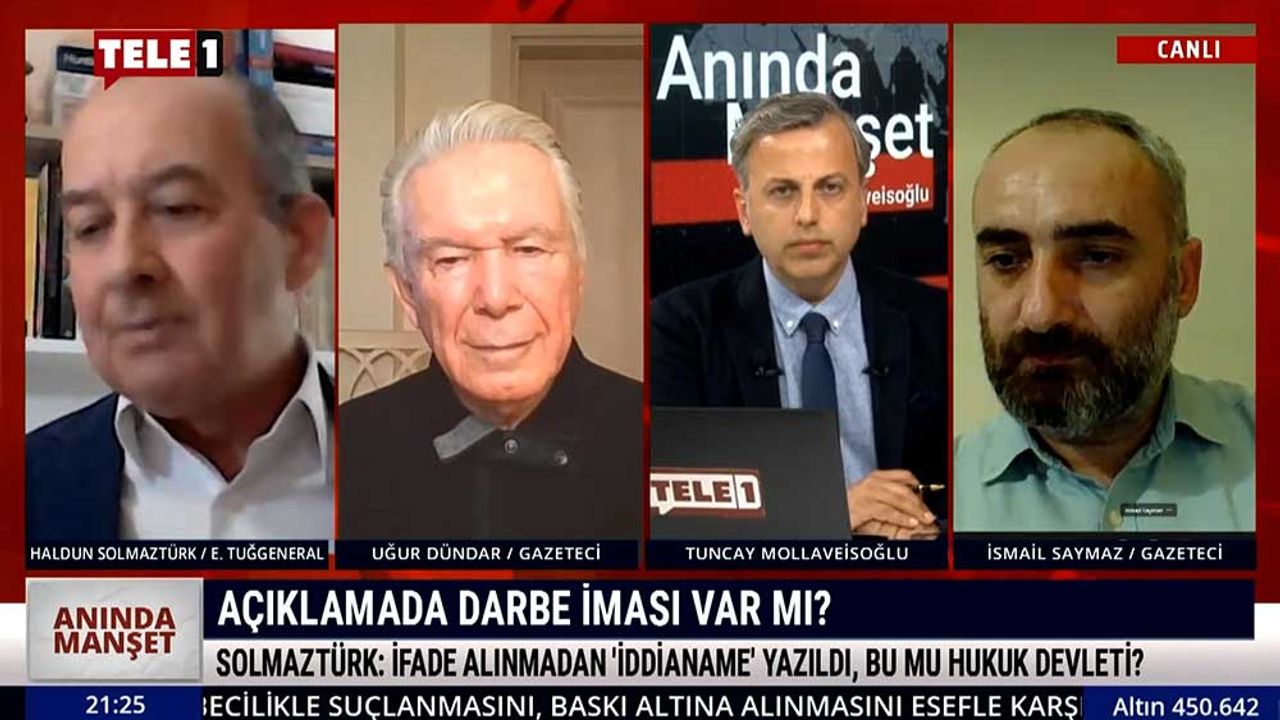 Genel Haldun Solmaztürk: İfade alınmadan 'iddianame' yazıldı - ANINDA MANŞET (5 NİSAN 2021) 05.04.2021 - 21:46 05.04.2021 - 21:46 Tuncay Mollaveisoğlu'nun sunduğu Anında Manşet'in bu haftaki konukları; Gazeteci İsmail Saymaz, Gazeteci Uğur Dündar, Avukat Celal Ülgen ve Emekli Tuğgeneral Haldun Solmaztürk oldu. Programda, emekli amirallerin Montrö açıklamaları değerlendirildi.