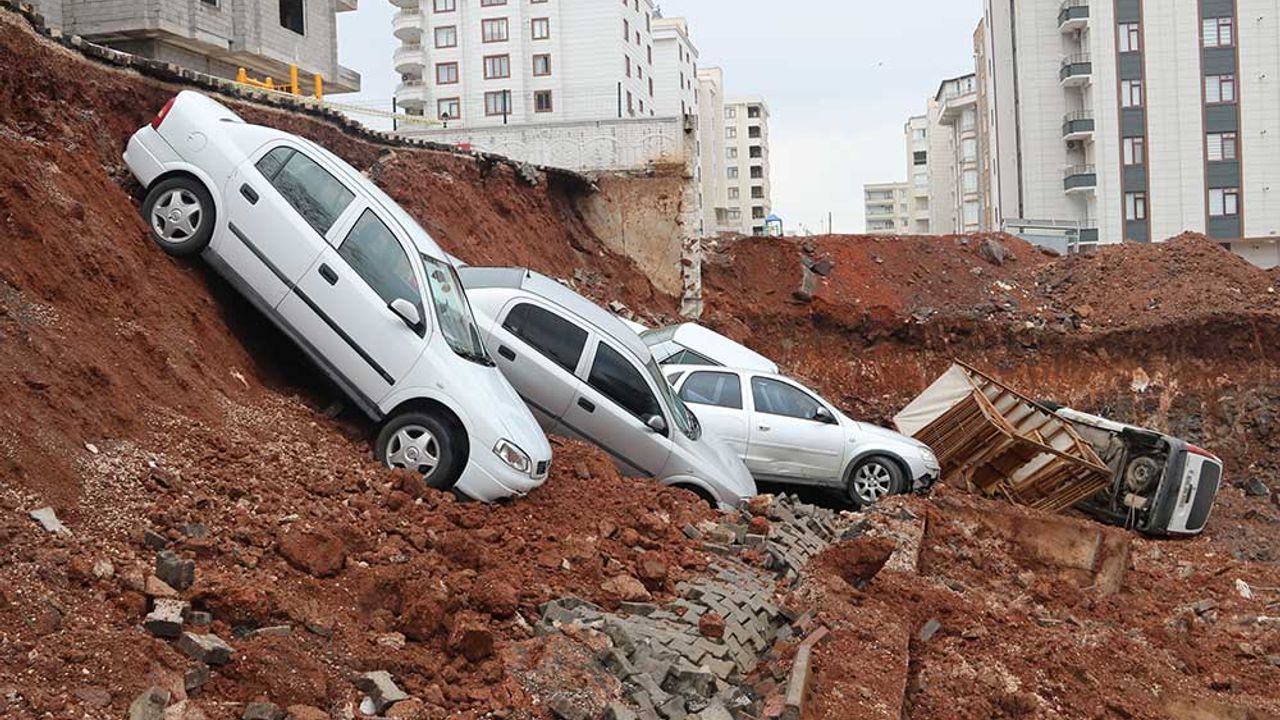 Şanlıurfa'da bir binanın istinat duvarının çökmesi sonucu 6 araç, yandaki inşaatın temeli için kazılan yere düştü.