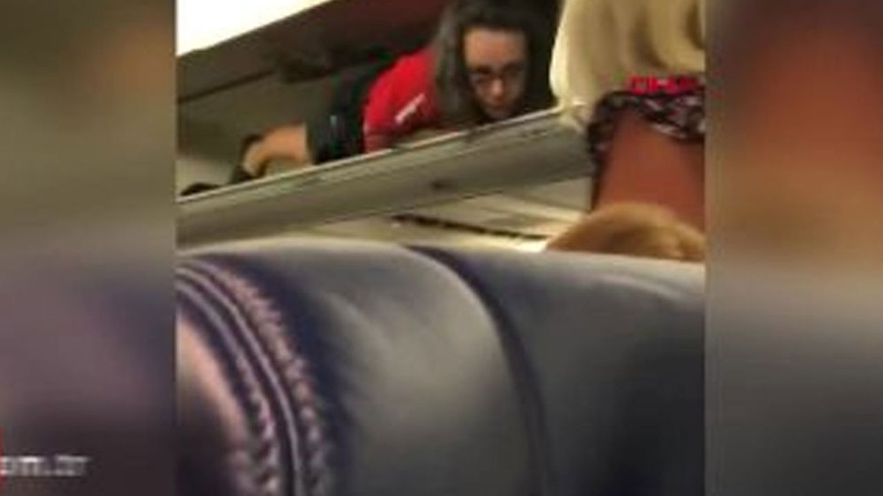 ABD'de bir uçakta kabin görevlisi, bagaj koyulan bölmelere uzandı ve yolcularla muhabbet etti. O anlar, telefon kamerasına yansıdı.