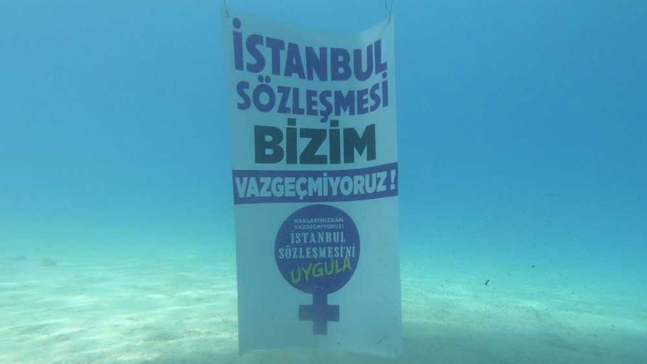 AKP'li Cumhurbaşkanı Erdoğan'ın kararı ile Türkiye'nin İstanbul Sözleşmesi'nden çekilmesine yönelik tepkiler devam ederken İstanbul Sözleşmesi'ni Uygula Kampanya Grubu deniz altında pankart açtı.