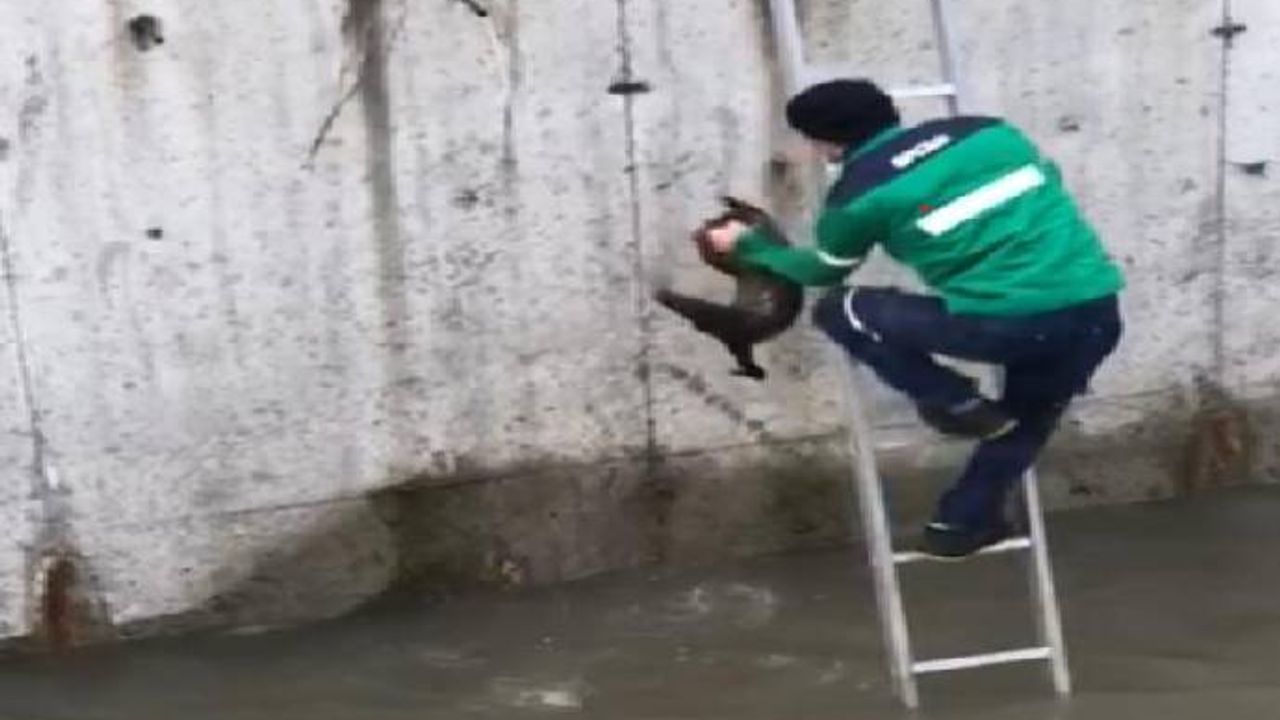 Zonguldak'ın Ereğli ilçesinde, dereye düşen sokak kedisini akaryakıt istasyonu çalışanları kurtardı.