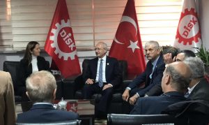 Kılıçdaroğlu, Beylikdüzü Belediye Başkanı Ekrem İmamoğlu ile görüşmesinin ardından DİSK’in (Türkiye Devrimci İşçi Sendikaları Konfederasyonu) Beşiktaş’taki genel merkezine geldi. Ziyarette konuşan DİSK Genel Başkanı Arzu Çerkezoğlu, son günlerde gündemde olan asgari ücret tartışmasına değinerek; “Türkiye'de işçiler gerçekten son derece zor yaşam koşullarıyla baş etmeye çalışıyor. Asgari ücretin belirlenmesi sürecini devletin toplumla yaptığı en büyük toplumsal sözleşme olarak görüyoruz” dedi.