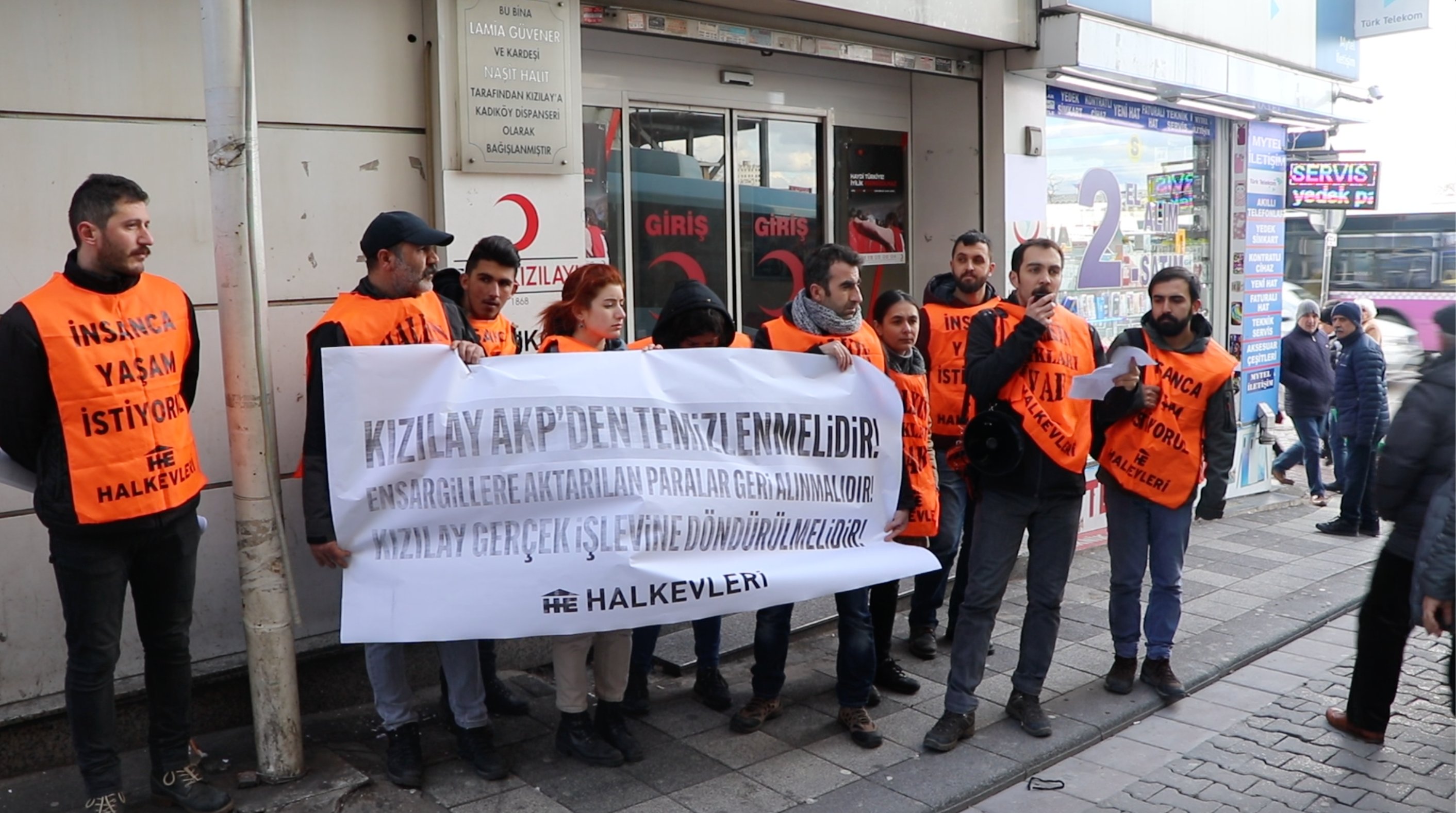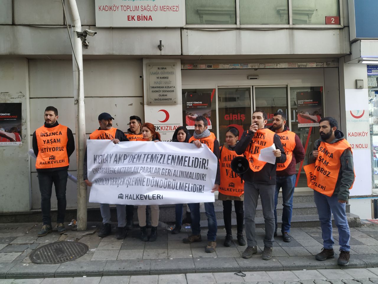Kızılay Kadıköy Şubesi önünde düzenlenen eylemde, “Kızılay, AKP’den temizlenmelidir” yazılı pankart açan Halkevciler, “AKP elini Kızılay’dan çek” sloganı attı.