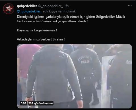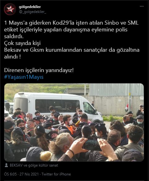 İstanbul Esenyurt'ta Kod 29 ile işten çıkartılan işçilerin direnişine yapılan polis müdahalesinde çok sayıda işçi ve direnişe destek vermek amacıyla gelen Gölgedekiler müzik grubu ve BEKSAV üyeleri de gözaltına alındı. Gölgedekiler müzik grubu müzik grubu sosyal medya hesabında yaptığı paylaşımda, "1 Mayıs'a giderken Kod29'la işten atılan Sinbo ve SML etiket işçileriyle yapılan dayanışma eylemine polis saldırdı. Çok sayıda kişi Beksav ve Gksm kurumlarından sanatçılar da gözaltına alındı! Direnen işçilerin yanındayız! Direnişteki işçilere şarkılarıyla eşlik etmek için giden Gölgedekiler Müzik Grubunun solisti Sinan Gökçe gözaltına alındı! Dayanışma Engellenemez! Arkadaşlarımızı Serbest Bırakın!" ifadeleri kullanıldı. İşte o paylaşımlar;