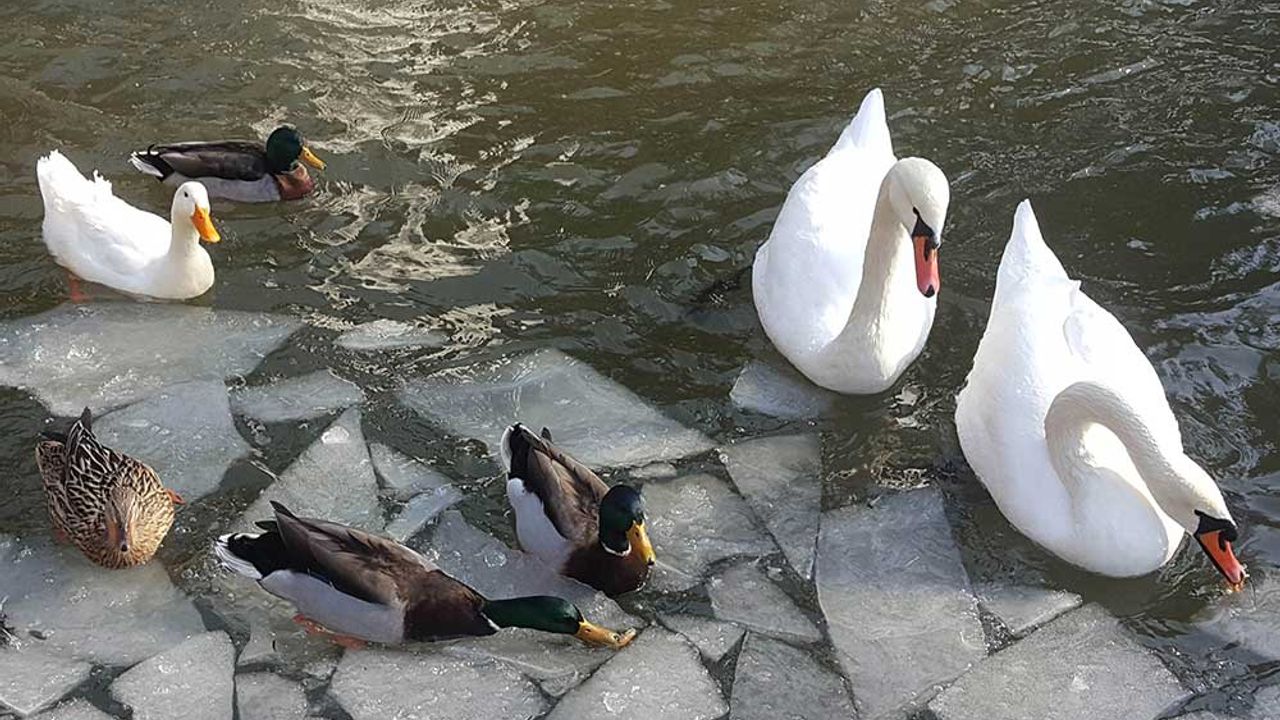Ankara'nın simgelerinden biri olan Kuğulu Park'taki havuz buz tuttu. Parkın sakinleri olan kuğular, kazlar ve ördekler...