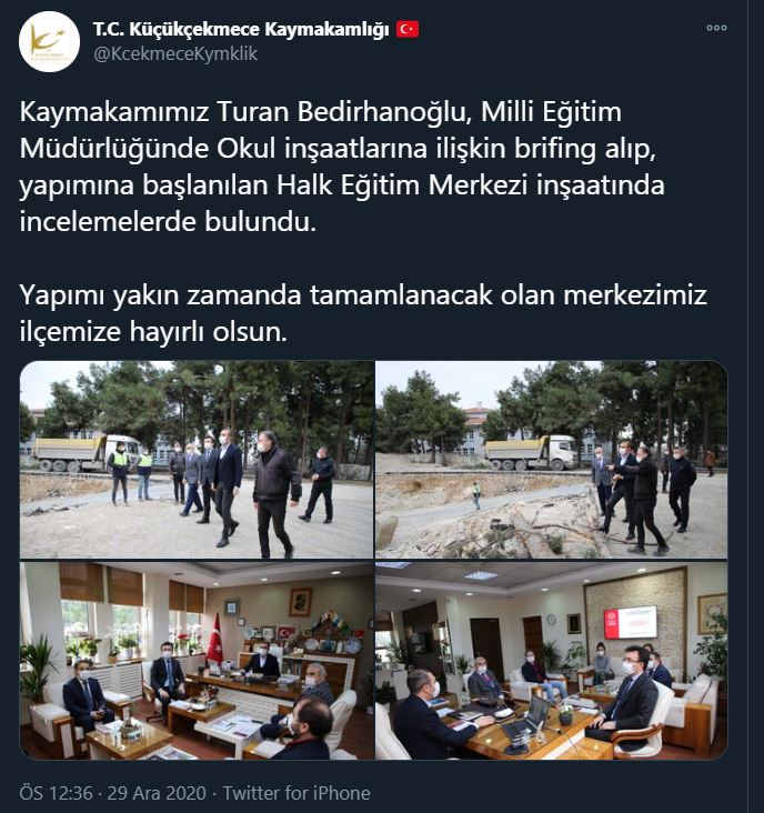Küçükçekmece Kaymakamlığı tarafından sosyal medya hesabından yaptığı paylaşımda bölgede yapılan inşaatın Milli Eğitim Müdürlüğü tarafından yapıldığı söylendi. Açıklamada " Kaymakamımız Turan Bedirhanoğlu, Milli Eğitim Müdürlüğünde Okul inşaatlarına ilişkin brifing alıp, yapımına başlanılan Halk Eğitim Merkezi inşaatında incelemelerde bulundu. Yapımı yakın zamanda tamamlanacak olan merkezimiz ilçemize hayırlı olsun." dendi.