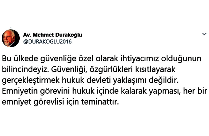 "Ekrem Başkan bir baro başkanı hatta avukat olduğunu söylemeden yurttaşların çok ihtiyacı olan bir dersi polise ve yurttaşlara verdi" diyen Durakoğlu, "Ekrem Başkan'ının özelinde bu ülkede var olan, otoriterleşme eğilimine ya da hukuk devleti iddiasının yol olmasının giderek bir polis devletine dönüşmüş olmasını tartışıyoruz. Bu ülkenin polis devleti olduğu gerçeğine doğru gidiyoruz" ifalerini kullandı.