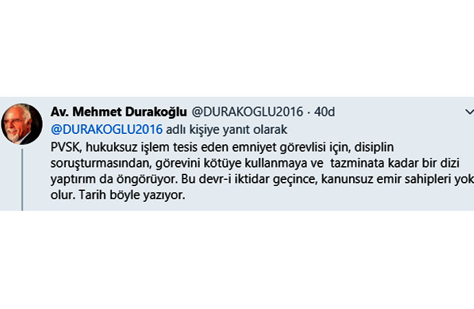 "PVSK, hukuksuz işlem tesis eden emniyet görevlisi için, disiplin soruşturmasından, görevini kötüye kullanmaya ve tazminata kadar bir dizi yaptırım da öngörüyor. Bu devr-i iktidar geçince, kanunsuz emir sahipleri yok olur. Tarih böyle yazıyor."