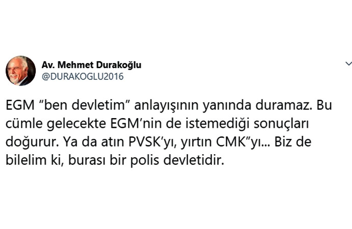 "EGM “ben devletim” anlayışının yanında duramaz. Bu cümle gelecekte EGM’nin de istemediği sonuçları doğurur. Ya da atın PVSK’yı, yırtın CMK”yı... Biz de bilelim ki, burası bir polis devletidir."
