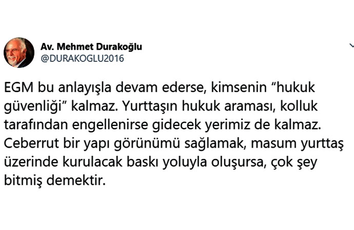 "EGM bu anlayışla devam ederse, kimsenin “hukuk güvenliği” kalmaz. Yurttaşın hukuk araması, kolluk tarafından engellenirse gidecek yerimiz de kalmaz. Ceberrut bir yapı görünümü sağlamak, masum yurttaş üzerinde kurulacak baskı yoluyla oluşursa, çok şey bitmiş demektir."