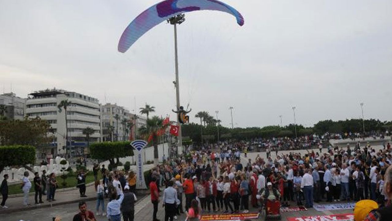 HATAY'ın İskenderun ilçesinde 1 Mayıs Emek ve Dayanışma Günü kutlamalarında Amanos Dağları'nın zirvesinden Türk bayraklarıyla atlayan 2 yamaç paraşütçüsünün gösterisi dikkat çekti.