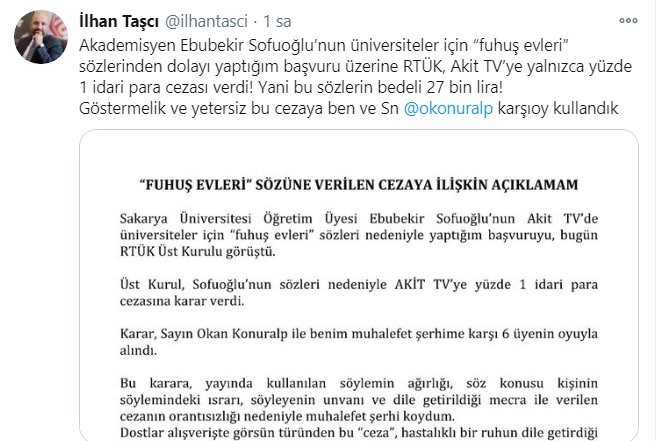 Ebubekir Sofuoğlu’nun Akit TV’de üniversiteler için kullandığı “fuhuş evleri” sözleri nedeniyle Radyo ve Televizyon Üst Kurulu (RTÜK) üyesi İlhan Taşçı'nın yaptığı başvuru, bugün RTÜK Üst Kurulu'nda görüşüldü. Kurul, Sofuoğlu’nun sözleri nedeniyle Akit TV’ye yüzde 1 idari para cezasına karar verdi. Karar, RTÜK üyeleri İlhan Taşçı ile Okan Konuralp'in muhalefet şerhine karşı 6 üyenin oyuyla alındı.