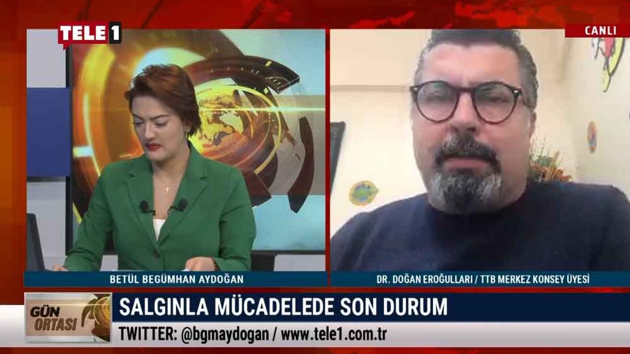 B. Begümhan Aydoğan'ın hazırlayıp sunduğu Gün Ortası'nın bugünkü konuğu; TTB Merkez Konsey Üyesi Dr. Doğan Eroğulları oldu. Eroğulları, sağlık çalışanlarının yüzde kaçının aşı olduğunu aktardı ve değerlendirmelerde bulundu.