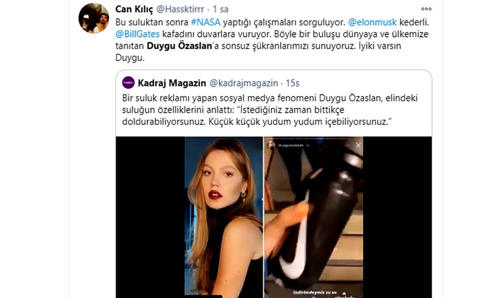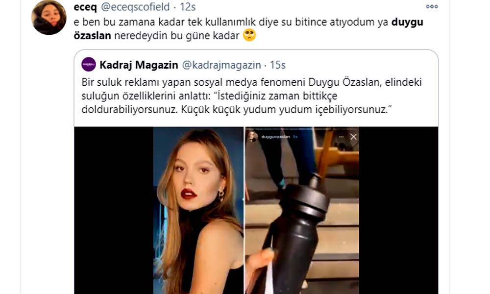Sosyal medya fenomeni Duygu Özaslan, reklamını yaptığı suluğu tanıtırken alay konusu oldu. Özaslan'ın suluğu anlatırken kullandığı "İstediğim zaman bittikçe doldurabiliyorum. Küçük küçük, yudum yudum içebiliyorsunuz" ifadeleri sosyal medya kullanıcıları tarafından tiye alındı.