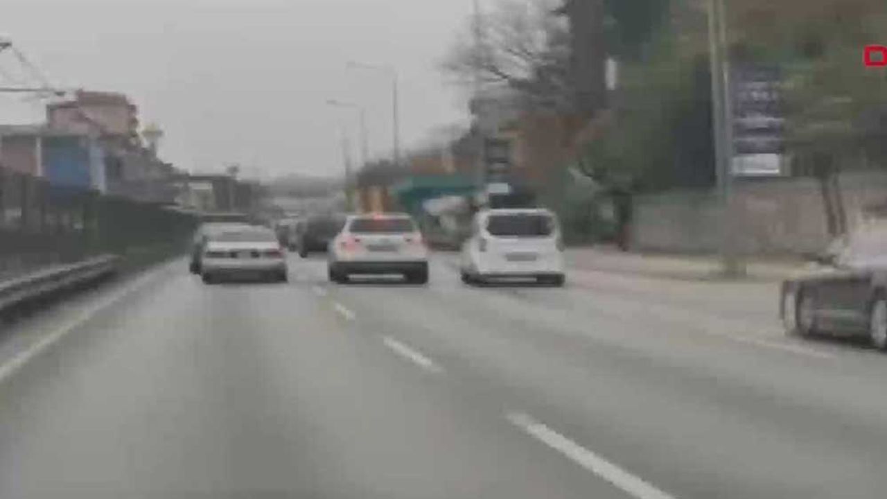 Bursa’da, sürücüsünün Sanayi Caddesi’nde makas atarak ilerlediği otomobil, bir başka sürücü tarafından görüntülendi.