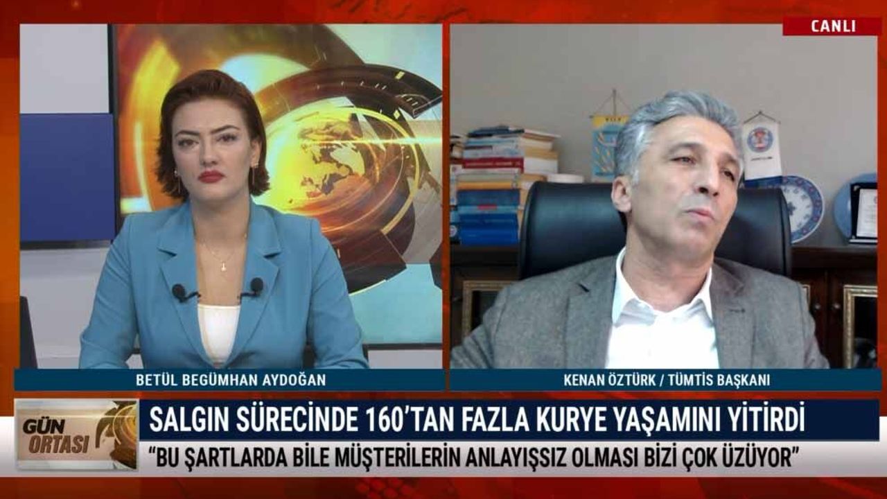 Betül Begümhan Aydoğan'ın sunduğu Gün Ortası'nın bugünkü konuğu; TÜMTİS Başkanı Kenan Öztürk oldu. Öztürk, salgın sürecinde 160'tan fazla kuryenin yaşamını yitirmesi hakkında değerlendirmelerde bulundu.