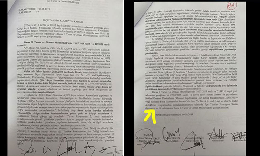 Bursa İl Tarım Müdürlüğü, Solakoğlu’na ait çiftlikte inceleme yaptı. Raporda “Feyz Hayvancılık Tarım Gıda Sanayii ve Ticaret A.Ş’nin Küçükkaraağaç, Sarıbademler, Yenisarıbey, Yolağzı ve Yukarıfevzipaşa mahallerinde kullandığı arazilerde yapılan kontrollerde, çiftçi kayıt sisteminde ürün kayıt bilgileri ile arazide karşılaşılan birinci ve ikinci üretim ürün bilgileri arasında farklılık olduğu ve 12 haziran tarihli Yem Bitkileri desteklemesi müracaat formunda belirtilen ürün deseni, mevcut ürün deseni ile uyumsuz olduğu” görüşüne yer verildi. Raporu inceleyen Karacabey Kaymakamlığı İlçe Tarım ve Orman Müdürlüğü, İlçe Tahkim Komisyonu, “30373 sayılı Resmi Gazete’de yayımlanan Bitkisel Üretime Destekle Ödemesi Yapılmasına dair tebliğ hükümlerince Feyz Hayvancılık Tarım Gıda Sanayii ve Ticaret A.Ş’nin 5 yıl süreyle hiç bir destekleme programından yararlandırılmamasına” oy birliği ile karar verdi.