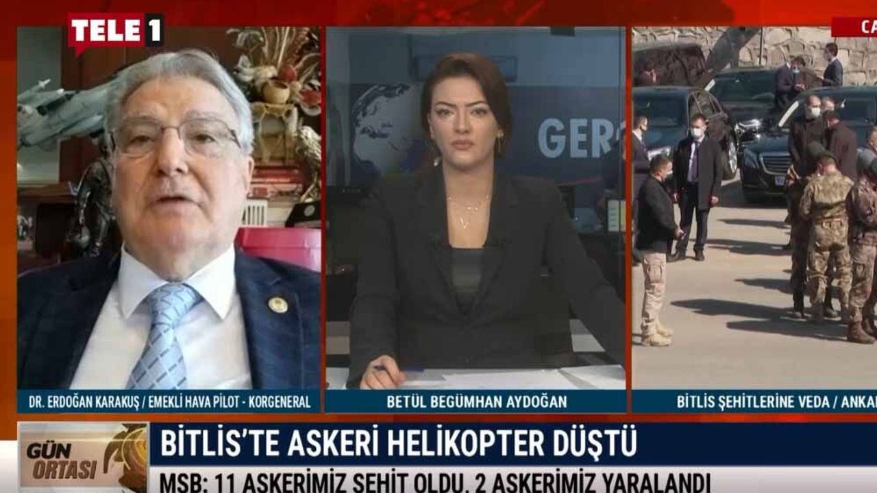 Betül Begümhan Aydoğan'ın sunduğu Gün Ortası'nın bugünkü konuğu; Emekli Hava- Pilot Korgeneral Dr. Erdoğan Karakuş oldu. Karakuş, Bitlis'tr askeri helikopterin düşmesini değerlendirip, yorumlamalarda bulundu.