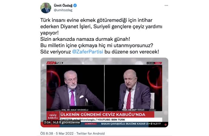Zafer Partisi Genel Başkanı Ümit Özdağ, katıldığı programda Diyanet İşleri Başkanlığı’nın Suriyelilere yönelik yaptığı yıllık 8 milyar dolarlık çeyiz yardımını eleştirdi. Özdağ "Bu ülkede ekonomik sıkıntıdan intihar eden analar babalar var. Sizin arkanızda namaza durmak günah" dedi.