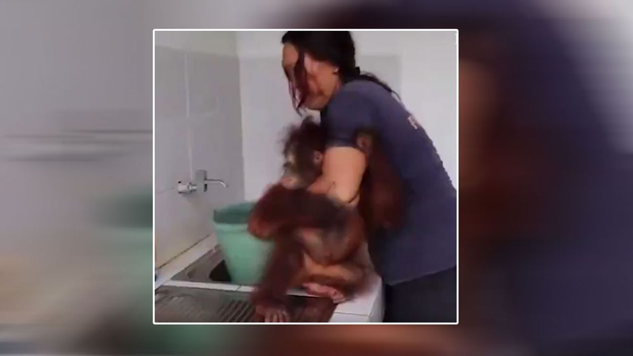 Yavru orangutanın banyo keyfi