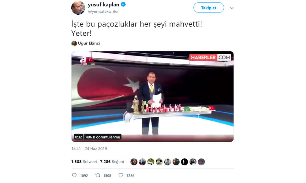 Yeni Şafak yazarı Yusuf Kaplan, kişisel Twitter hesabından, A Haber’de yayınlanan Sabah Ajansı’nın sunucusu Erkan Tan’ın canlı yayındaki kısa bir anını paylaştı. Yusuf Kaplan Erkan Tan’ın canlı yayındaki ifadeleri için "paçozluk" tabirinde bulundu. Erkan Tan, dünkü canlı yayında, “Ordu valisine ‘it’ diye küfür eden adam İstanbul’un belediye başkanı seçilmiş oldu. Başka yalanları da var. Biz vatandaşlardan gelen isteği arz ediyoruz. Vatandaşlar Adalet ve Kalkınma Partisi’nden Ordu Valisi’nin İstanbul Valiliği’ne tayin edilmesini istiyor” ifadelerini kullanmıştı. Erkan Tan’ın bu sözlerini hedef alan Yeni Şafak Yazarı Kaplan, “İşte bu paçozluklar her şeyi mahvetti! Yeter” diye tepki gösterdi.