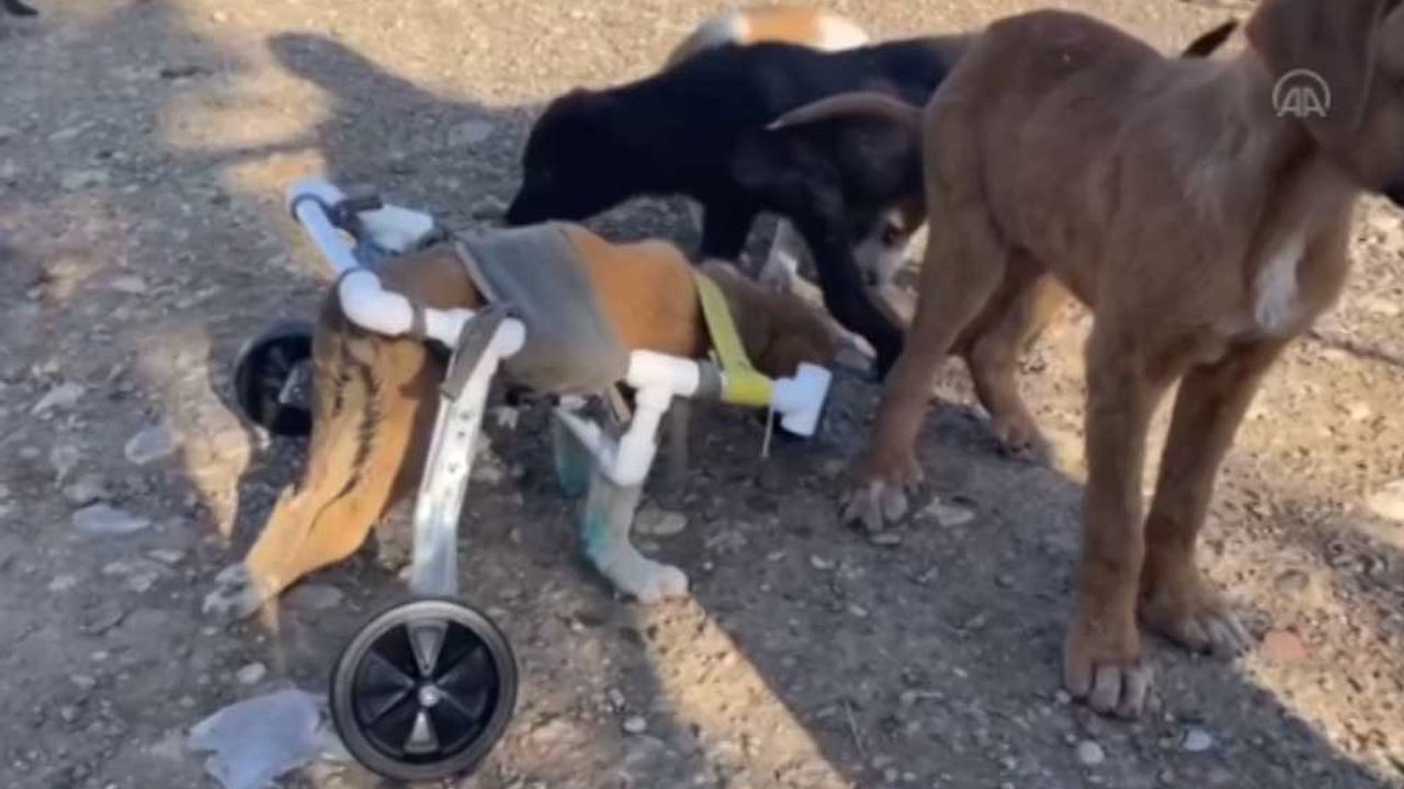 Çorum'da bir okul müdürü, arka bacakları hareket etmeyen 3 aylık köpeğin yürümesi için su boruları ve bisiklet destek tekerleri kullanarak yürüteç yaptı.