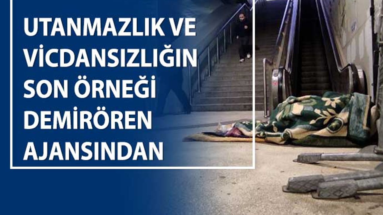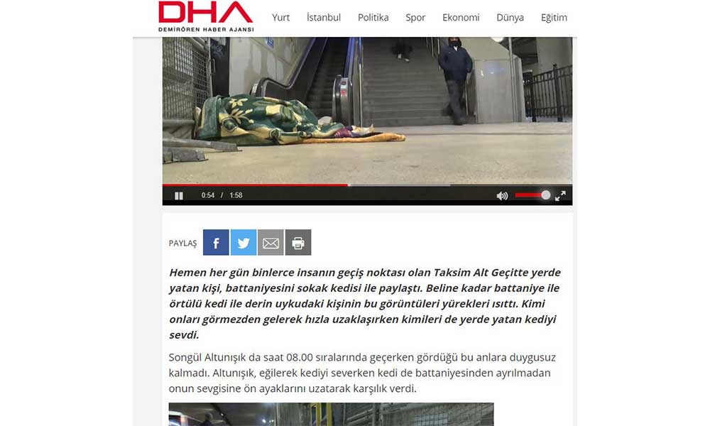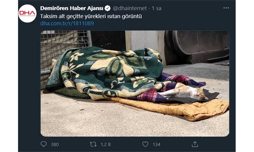 AKP'ye yakın Demirören Haber Ajansı bir skandala imza attı. Taksim alt geçidinde yerde yatan bir evsiz vatandaşın battaniyesini bir kedi ile paylaştığı görüntüleri çeken DHA, evsiz yurttaşın çektiği dramı hiçe sayıp adeta dalga geçercesine "Taksim alt geçitte yürekleri ısıtan görüntü" diyerek abonelere servis etti.