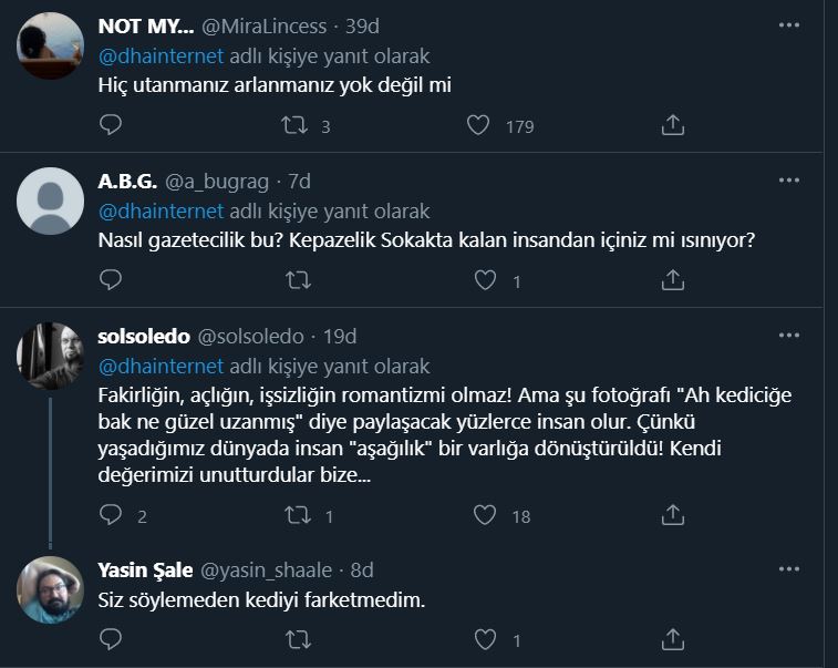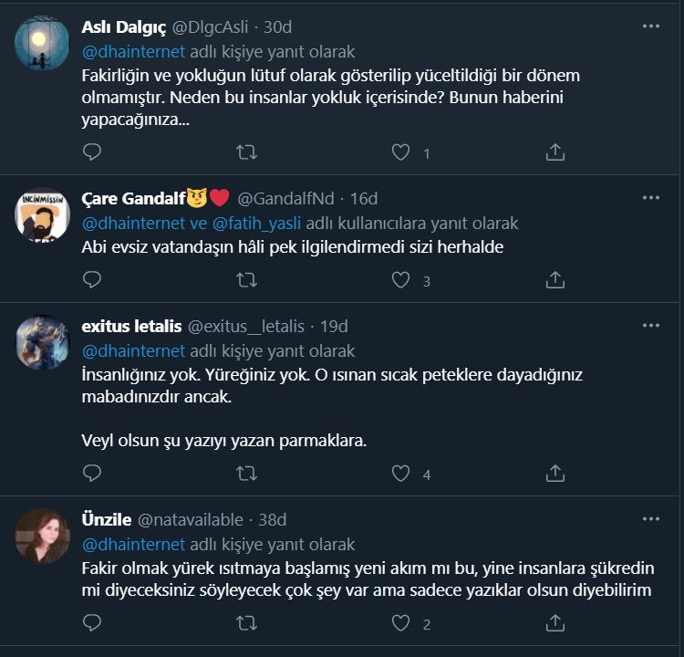 Yandaş Demirören Haber Ajansı'nın geçtiği habere bir çok sosyal medya kullanıcısı tepki gösterdi. Kullanıcılar " Abi evsiz vatandaşın hâli pek ilgilendirmedi sizi herhalde" diyerek habere isyan etti.