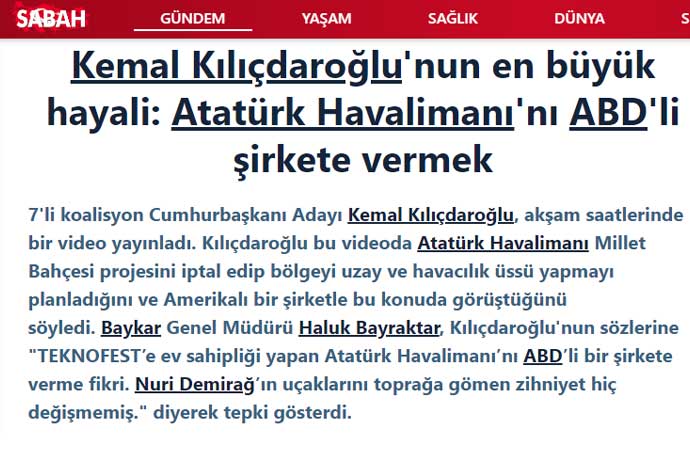 Yandaş Sabah Gazetesi ise bu habere Baykar Genel Müdürü Haluk Bayraktar'ın sözleriyle birlikte "Kemal Kılıçdaroğlu'nun en büyük hayali: Atatürk Havalimanı'nı ABD'li şirkete vermek" başlığıyla yer verdi.