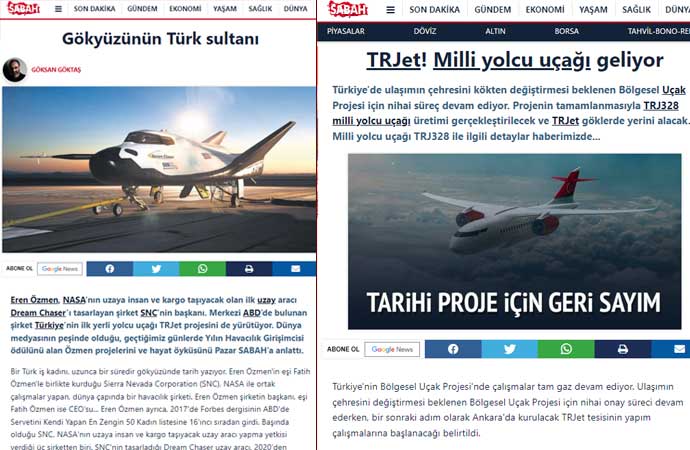 Ancak aynı gazete birkaç yıl önce SNC'yi 'yerli ve milli yolcu uçağımızı yapacak Türk firması' olarak duyurmuştu. Sabah'ın ürettiği uzay aracı için 'Gökyüzünün Sultanı' olarak başlık attığı şirket Kılıçdaroğlu'nun sahipleriyle görüştüğünü duyurmasının ardından birden 'ABD'li şirket' oldu.