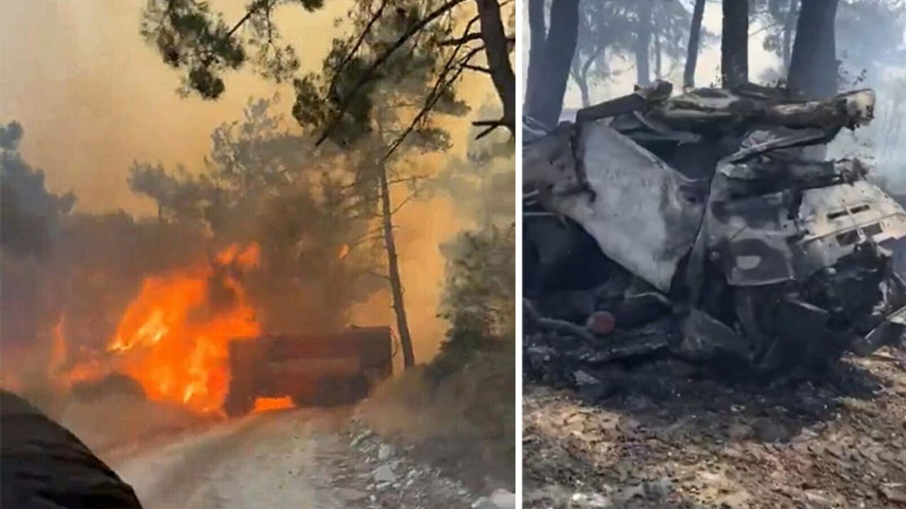 Yangına müdahale eden itfaiye ekibi alevlerin arasında kaldı. İtfaiye aracı kullanılamaz hale geldi.