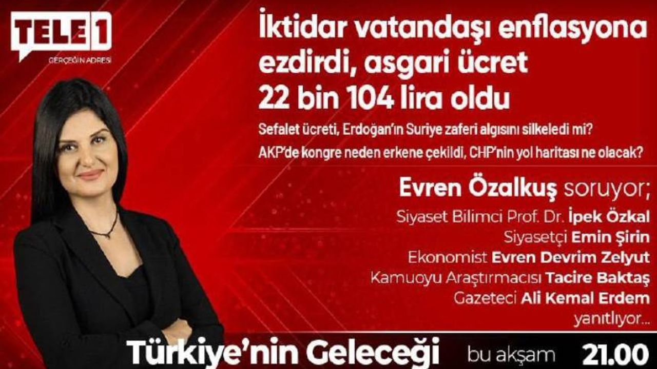 Ekonomist Evren Devrim Zelyut, Kamuoyu Araştırmacısı Tacire Baktaş, Siyasetçi Emin Şirin, Siyaset Bilimci Prof. Dr. İpek Özkal ve Gazeteci Ali Kemal Erdem; iktidarın patronların dediğini yapıp 22 bin 104 lira açıkladığı yeni asgari ücretle vatandaşı sürüklediği sefaleti, sefalet ücretinin AKP’li Cumhurbaşkanı Erdoğan’ın Suriye zaferi algısını silkeleyip silkelemediği, AKP’de kongrenin neden erkene çekildiği ve CHP’nin yol haritasının ne olacağını değerlendirecek. Türkiye’nin Geleceği programı, bu akşam saat 21.00 ila 23.50’de TELE1’de olacak.