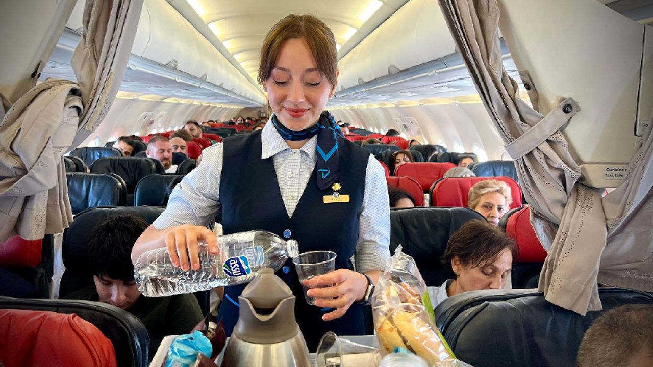 İkram edilen suların da şişede olmaması dikkat çekerken diğer yandan da bu durum tepki topladı. Uraloğlu'nun paylaştığı fotoğrafta hostesler suları birer bardağa doldurarak yolculara ikram etti.