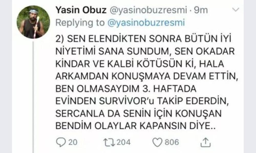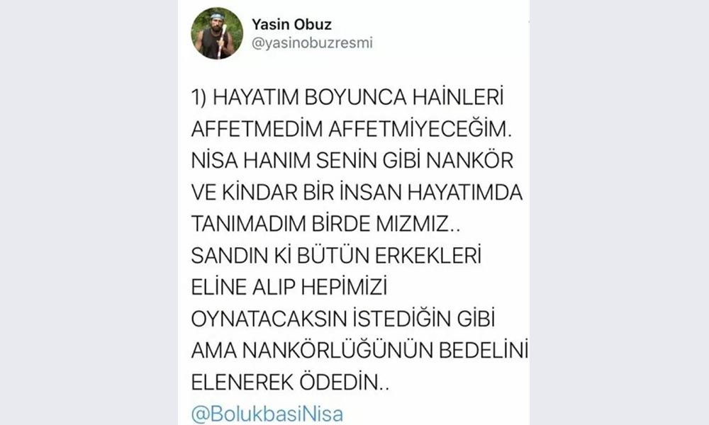 Obuz Twitter paylaşımlarında, "Nisa hanım senin gibi nankör ve kindar bir insan hayatımda tanımadım, bir de mızmız. Sandın ki tüm erkekleri eline alıp hepsini oynatacaksın istediğin gibi ama nankörlüğün bedelini eleyerek ödedin. Sercan'la da senin için konuşan bendim olaylar kapansın diye... Bildiklerimi açıklarsam yer yerinden oynar. Ateş olmayan yerden duman çıkmaz. Pisliğin tekisin" ifadelerini kullandı.İŞTE O PAYLAŞIMLAR