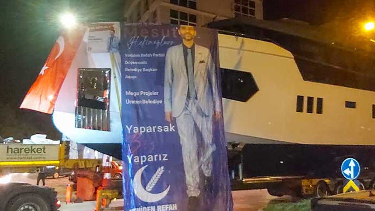 Antalya’da Yeniden Refah Partisi’nin Döşemealtı Belediye Başkan Adayı Mesut Hekimoğlu, lüks yatın yüklendiği kamyonun en önde yer aldığı konvoyla seçim turu attı.