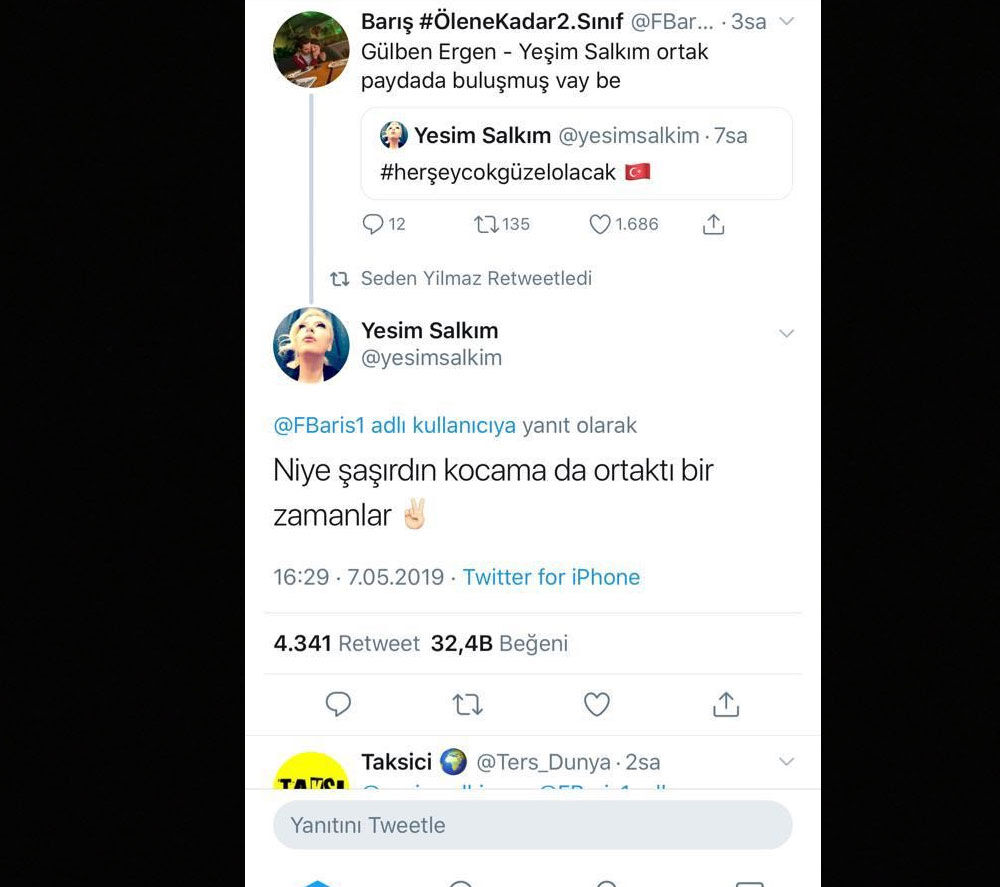 Bir sosyal medya kullanıcısı Yeşim Salkım'ın İmamoğlu için attığı destek mesajına, "Gülben Ergen-Yeşim Salkım ortak paydada buluşmuş vay be" yorumunu yaptı.Yeşim Salkım ise o mesaja, "Niye şaşırdın kocama da ortaktı bir zamanlar." mesajıyla cevap verdi. Yeşim Salkım'ı bu mesajı sosyal medyayı salladı.
