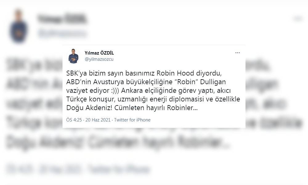 Sözcü yazarı yılmaz Özdil, SBK Holding'in sahibi iş insanı Sezgin Baran Korkmaz’ın ABD’nin isteği üzerine Avusturya’da tutuklanmasına ilişkin dikkat çeken ifadeler kullandı. Özdil, Sezgin Baran Korkmaz’ın Türk basınında “hayırsever iş insanı” olarak nitelendirildiğini hatırlattı. Avusturya'daki ABD Büyükelçiliği Maslahatgüzarı olarak görev yapan Robin Dunnigan'a atıfta bulunan Özdil, Twitter’dan yaptığı paylaşımda şu ifadeleri kullandı: “SBK’ya bizim sayın basınımız Robin Hood diyordu, ABD’nin Avusturya büyükelçiliğine “Robin” Dulligan vaziyet ediyor :))) Ankara elçiliğinde görev yaptı, akıcı Türkçe konuşur, uzmanlığı enerji diplomasisi ve özellikle Doğu Akdeniz! Cümleten hayırlı Robinler...”