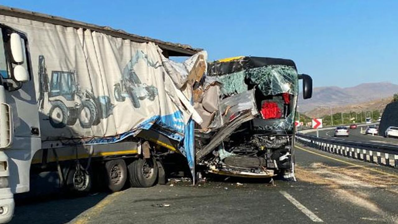 Elazığ'da yolcu otobüsü, aynı yönde seyir halinde olan TIR'a arkadan çarptı. Feci kazada 1 kişi öldü, 34 kişi de yaralandı.