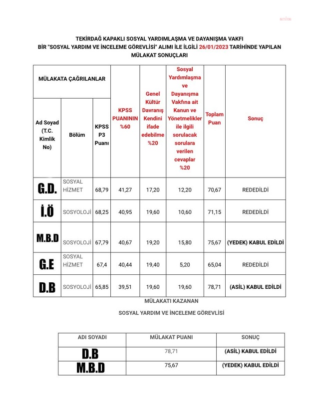 Tekirdağ Kapaklı Kaymakamlığı’nın 12 Ocak’ta duyurusunu yaptığı "sosyal yardım ve inceleme görevlisi" alımı için en yüksek KPSS puanı olan 5 kişi mülakata çağırılarak 26 Ocak 2023 tarihinde mülakat görüşmesine alındı. 27 Ocak’ta açıklanan mülakat ve işe alım sonuçları sonrası KPSS’den 65.85 ile en düşük puanı alan D.B., en yüksek mülakat puanını alarak 78,71 puanla asil olarak belirlendi. Yedek olarak belirlenen M.B.D. ise 75,67 puanla D.B.’den üç puan düşük aldı.