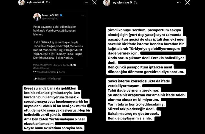 Dilan Polat - Engin Polat çiftinin haklarında çıkan kara para aklama iddialarının ardından tutuklanmasıyla birlikte başlayan tartışma devam ediyor. Gözler diğer sosyal medya fenomenlerine çevrilmişken gazeteci Murat Ağırel haklarında yurt dışı çıkış yasağı konulan sosyal medya fenomenlerinin isimlerini verdi. Bu isimler Eylül Öztürk,Feyzanur Başar,İlayda Topal,İlke Alagöz,Kadir Yiğit,Merve Nur Korkut,Muhammed Oğuz Başar,Murat Yiğit,Nurgül Yiğit,Tolunay Topal,Tuğba Demirhan,Yavuz Selim Korkut oldu.EYLÜL ÖZTÜRK'TEN AÇIKLAMA